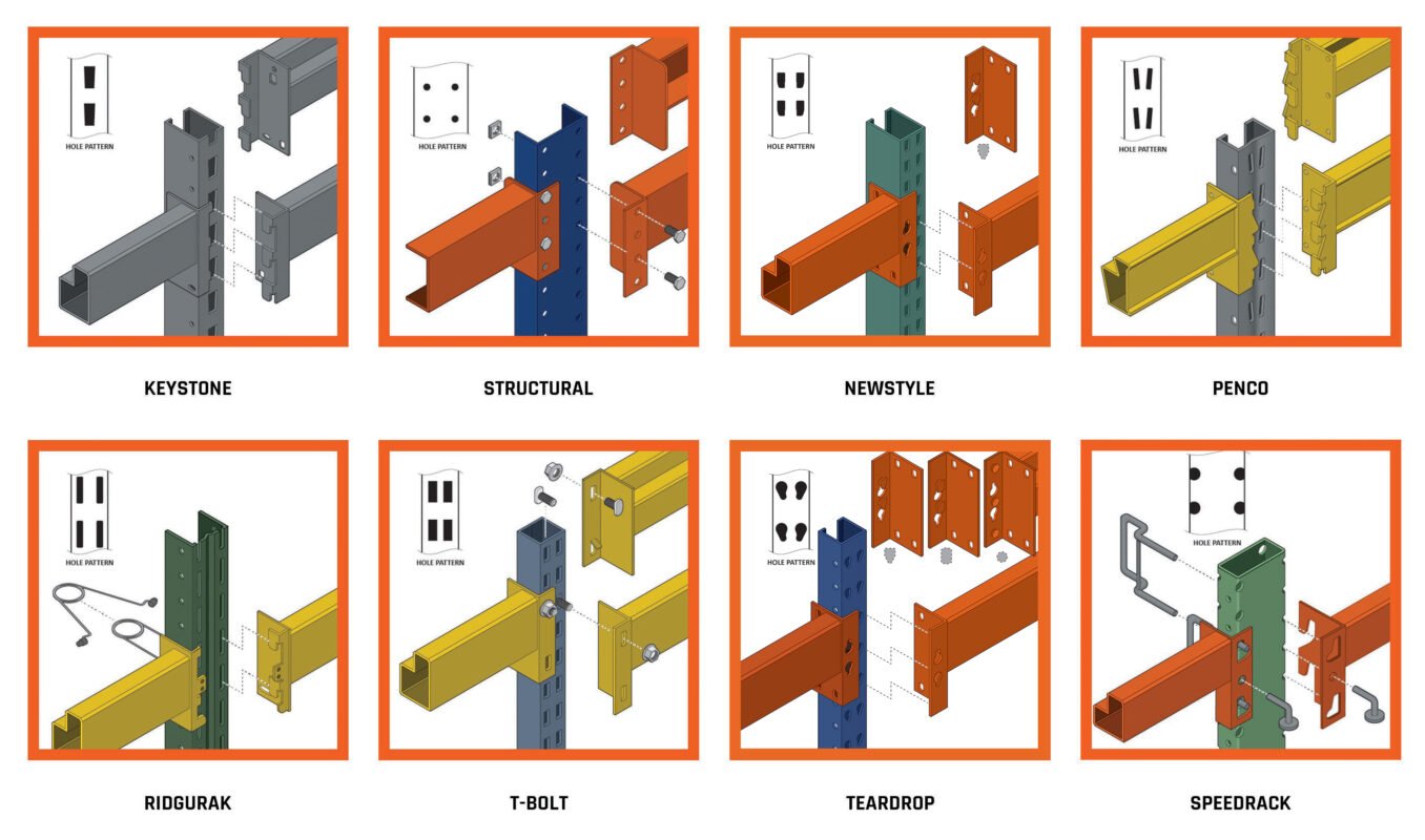 Sammons, is commonly found on the West Coast due to geographical proximity to former plants. Although the hole pattern is similar to the teardrop design upon first glance, the hole pattern sits on 4” centers vertically. The teardrop shape is only compatible with Sammons mushroom-shaped connector pins. Teardrop style racking is most commonly found with grey load beams and grey uprights. The largest manufacturer of Teardrop style racking is Hannibal Industries. We occasionally have this style in stock since we acquire used rack.